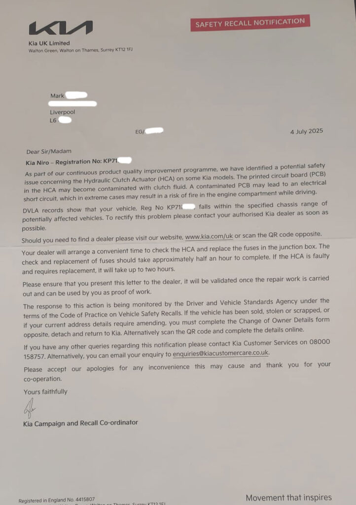 Kia UK has issued a critical safety recall notice for certain Kia Niro models due to a potentially dangerous fault linked to the Hydraulic Clutch Actuator (HCA), which could lead to an engine compartment fire. (See Below)