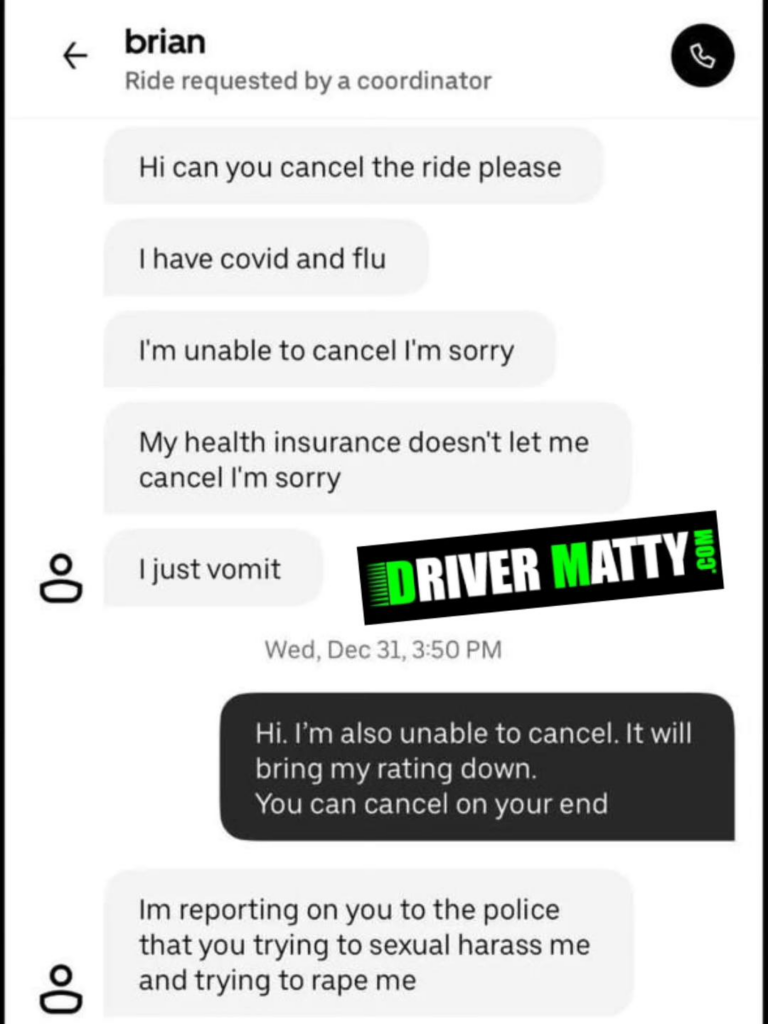 The driver responds by explaining that cancelling would negatively impact their driver rating and advises the passenger to cancel on their end instead. Shortly afterwards, the conversation takes a disturbing turn when the passenger threatens to report the driver to the police, falsely accusing them of sexual harassment and attempted rape — despite the two never meeting and the driver not having arrived.