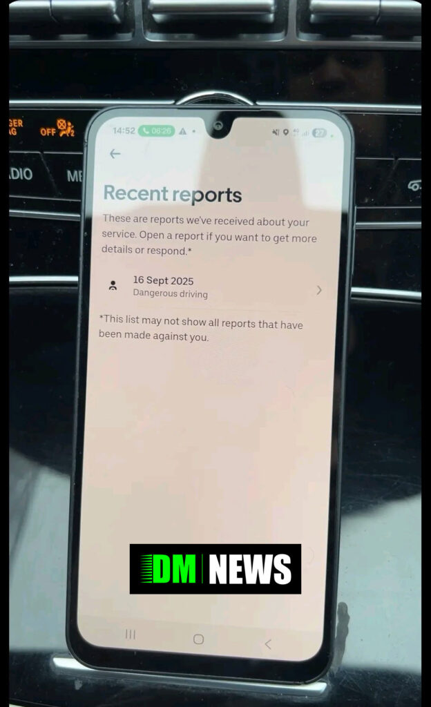 The image shared with DM News shows Uber’s “Recent reports” screen within the driver app, listing a “Dangerous driving” allegation dated 16 September 2025. Despite the date shown, the driver says they were only made aware of the report several months later, long after the trip would reasonably be remembered.