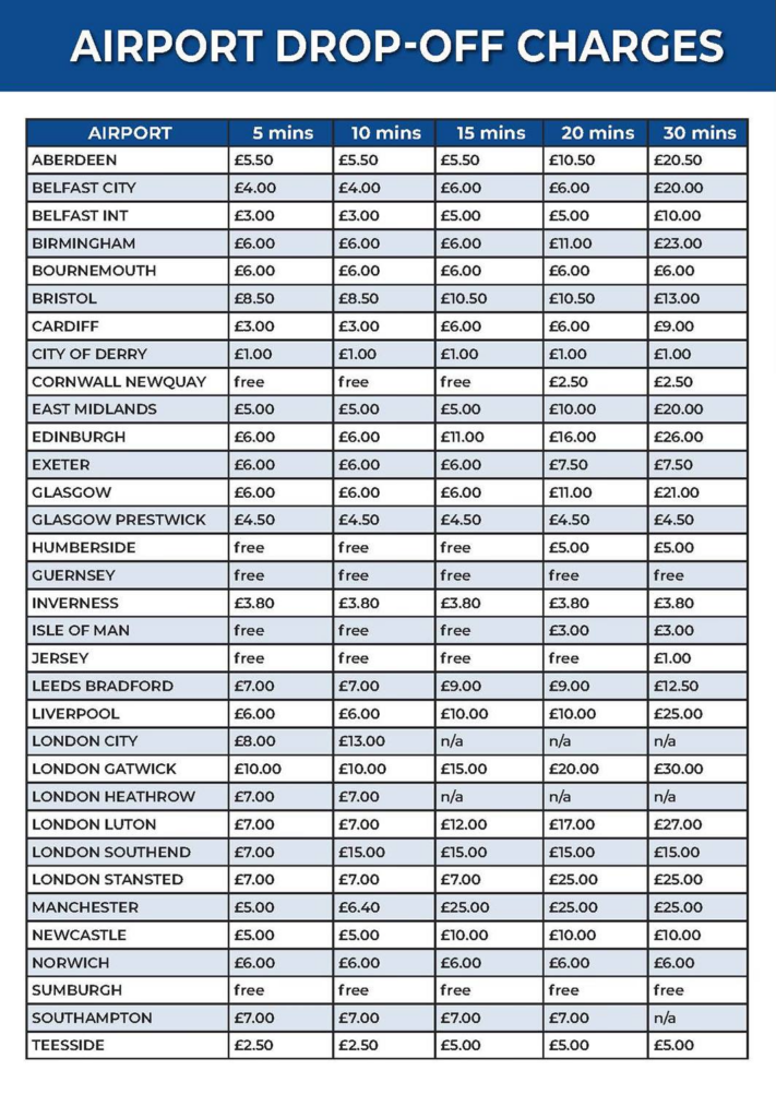 At the other end of the scale, a small number of regional airports — including City of Derry, Humberside, Sumburgh and Guernsey — still offer free drop-off periods, while others such as Cornwall Newquay provide free short stays before introducing modest fees.
